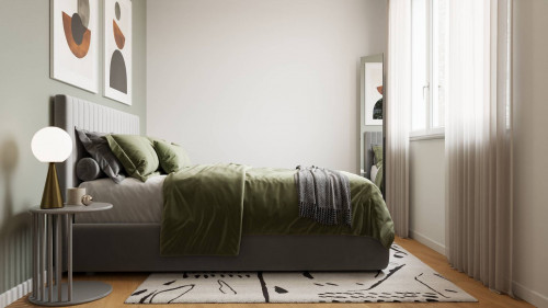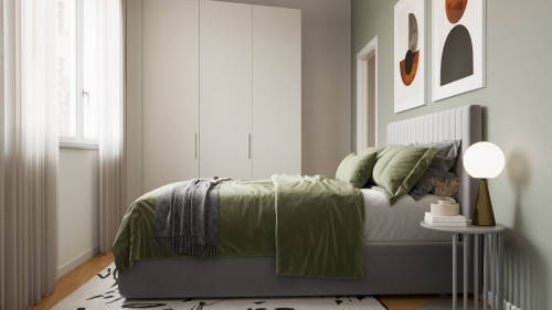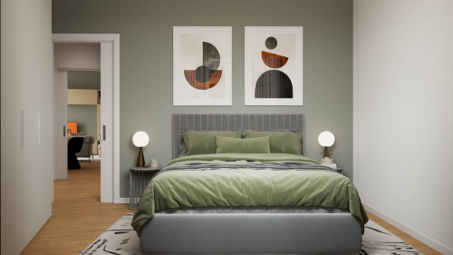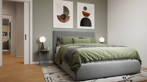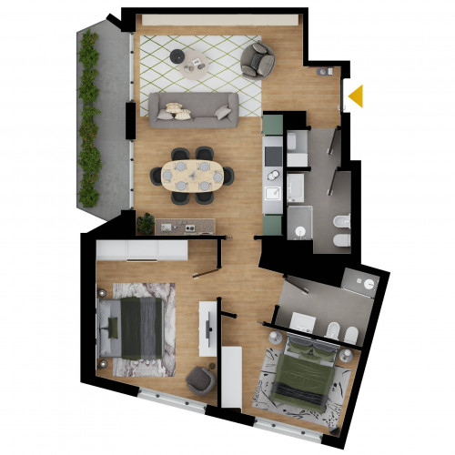 L'unità delle dimensioni interne pari a 94 mq circa risulta essere composta da ingresso su ampia zona giorno con cucina a vista, due camere matrimoniali, due bagni, disimpegno con piccola zona lavanderia ed ampio balcone che affaccia esternamente dalla zona giorno.