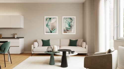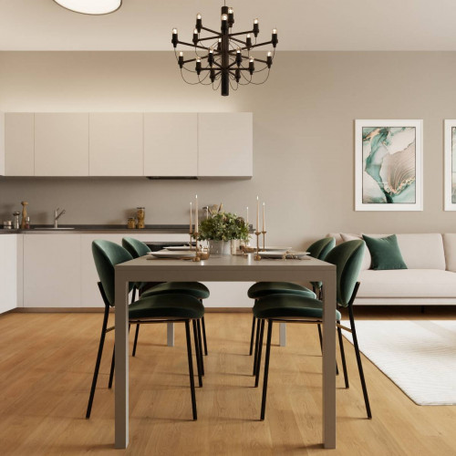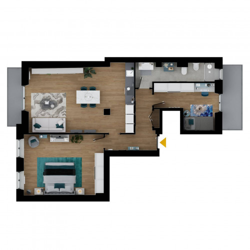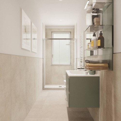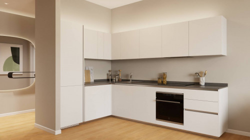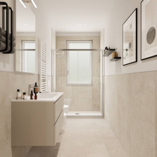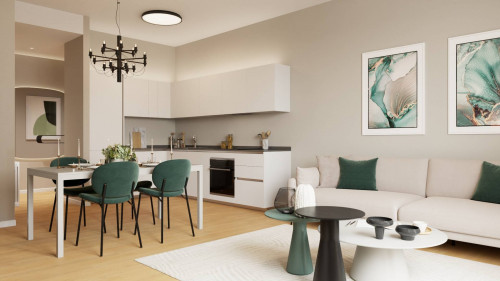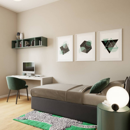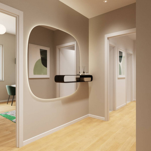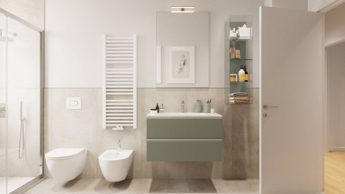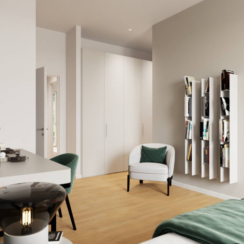 ingresso, soggiorno living con cucina a vista, due camere da letto matrimoniali di cui una con cabina armadio ed una camera singola, due bagni finestrati, balcone, terrazzino, doppia cantina e doppia soffitta.