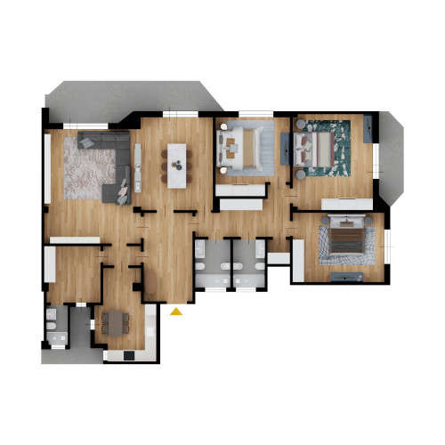 L'unità immobiliare si presenta con un salone spazioso oltre cucina abitabile in zona giorno, mentre la zona notte è composta da tre camere da letto, di cui due matrimoniali e una singola. Completano la proprietà uno studio, tre bagni e due balconi.