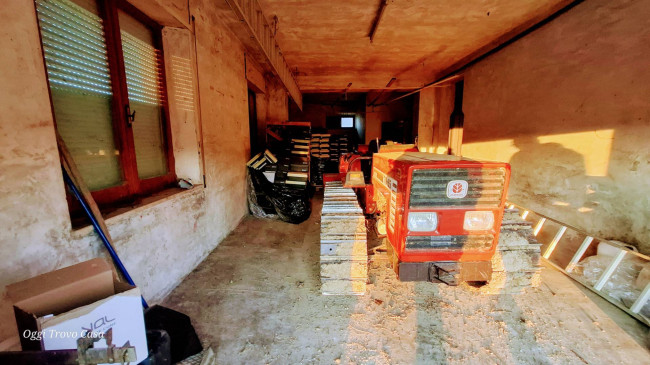 Primo piano con cucina, soggiorno, camino, bagno, garage, magazzino.